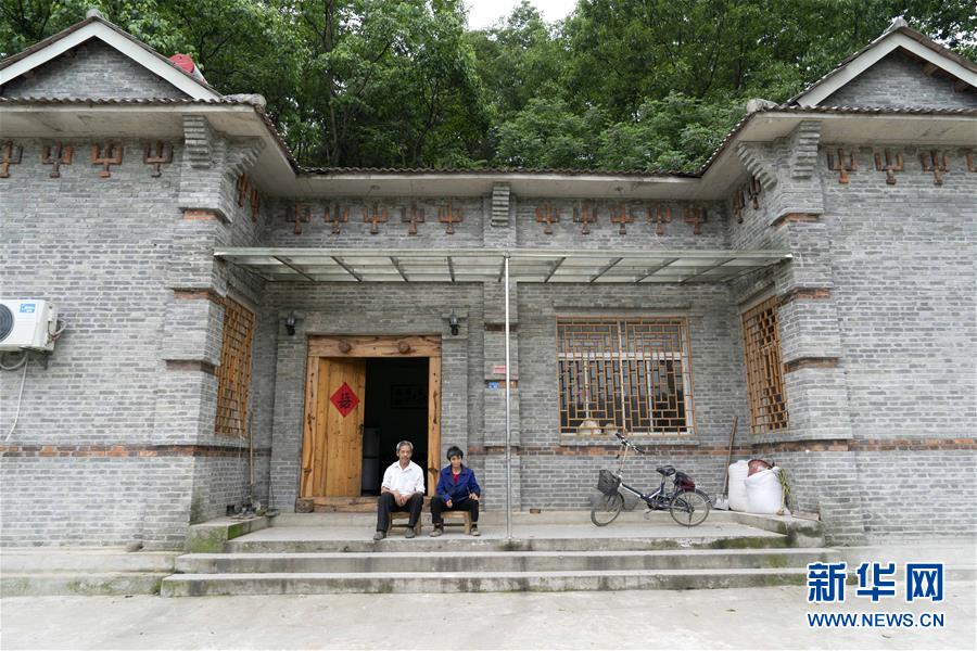 一名堰河村老人在新入住的民居的回廊休息(5月13日攝)。