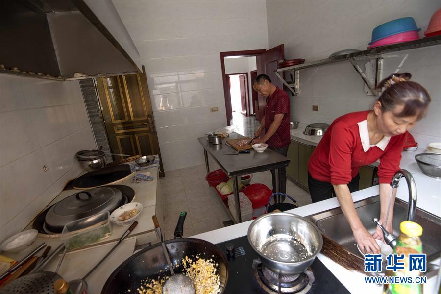 堰河村一對夫妻在自家新民居的廚房里忙活(5月12日攝)。