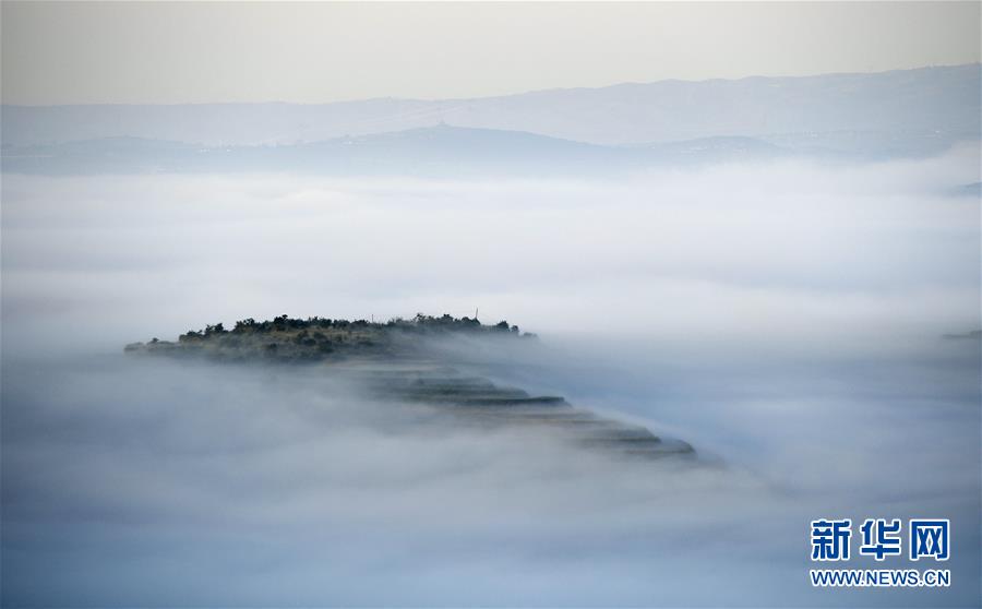 云霧繚繞的寧夏彭陽縣金雞坪梯田公園(7月17日攝)。新華社記者 王鵬 攝