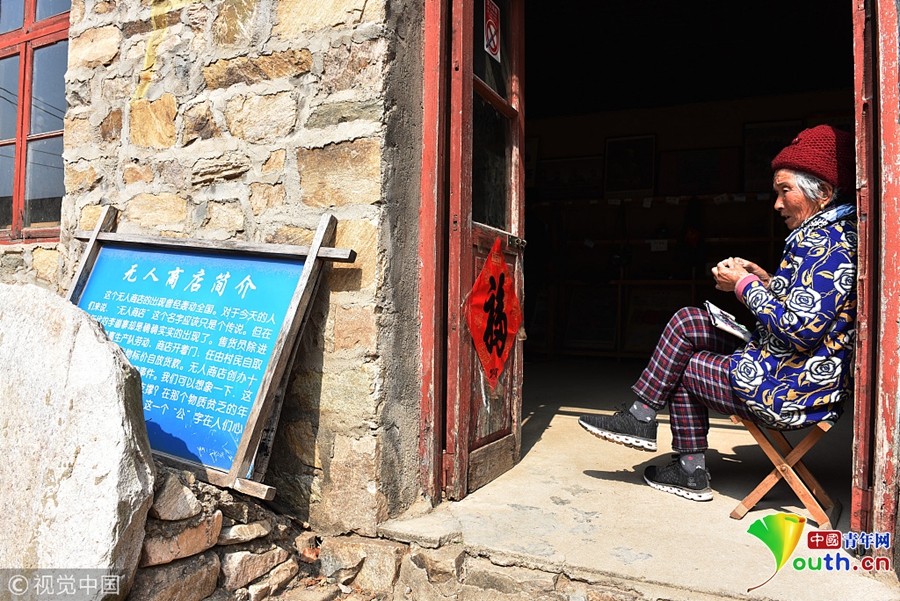 2018年3月11日,在山東省日照市五蓮縣街頭鎮(zhèn)大山深處的李崮寨村,負(fù)責(zé)管理“無(wú)人商店”的老人惠玉秀坐在商店門口納鞋墊。這個(gè)創(chuàng)建于1967年的“無(wú)人商店”,比馬云2017年創(chuàng)辦的“無(wú)人超市”早了50年,至今仍然營(yíng)業(yè)。