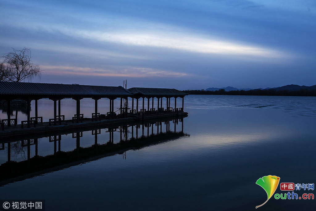2018年2月23日,北京頤和園。當天日落時分昆明湖上空出現夕陽余暉的美景,夢幻般的色彩將古老的皇家園林裝扮得美輪美奐,讓人流連忘返。來源:視覺中國