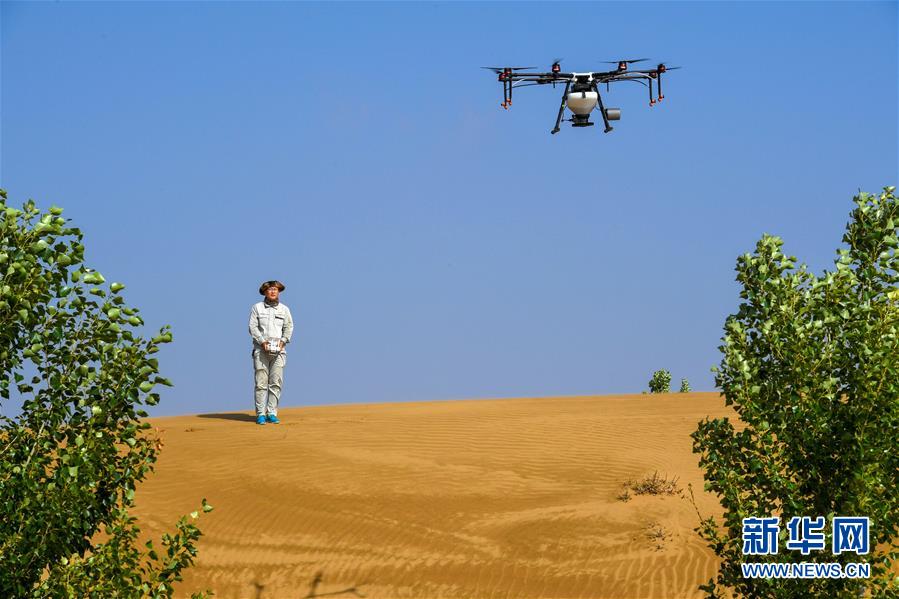 在內(nèi)蒙古鄂爾多斯市杭錦旗的庫布其沙漠中,技術(shù)人員操控?zé)o人機(jī)飛播造林(7月11日攝)。
