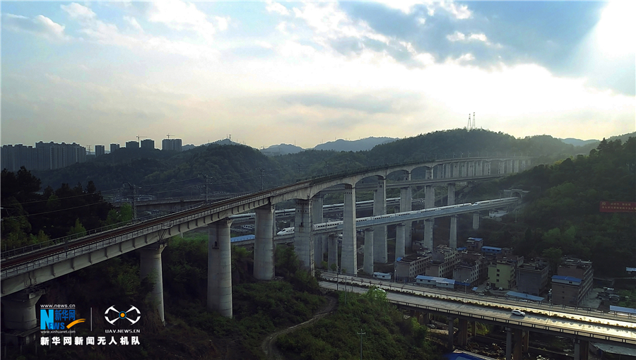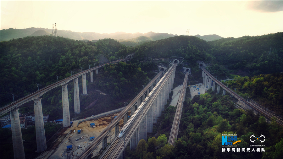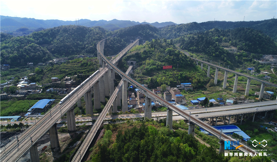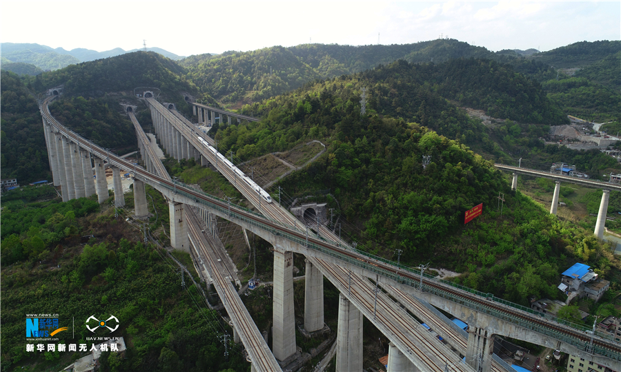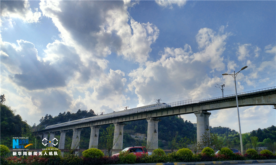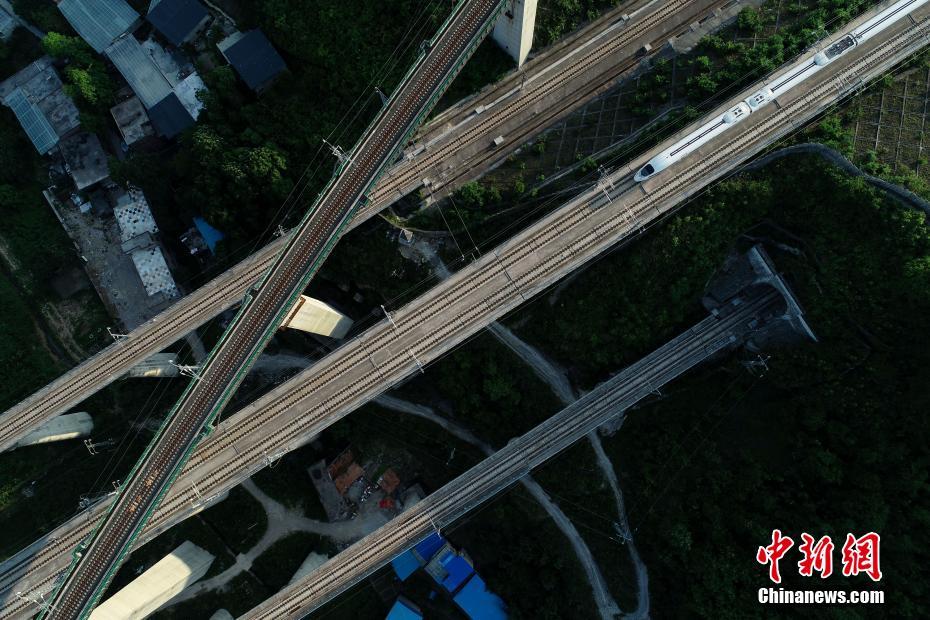 5月16日,航拍貴陽(yáng)市郊交織的五條高鐵線(xiàn)路,一列動(dòng)車(chē)駛出隧道。貴州省地處中國(guó)西南腹地,高原山地居多,因此高鐵建設(shè)的橋隧占比較高。在貴陽(yáng)市烏當(dāng)區(qū)新添寨,高鐵滬昆線(xiàn)、貴廣客運(yùn)專(zhuān)線(xiàn)、貴開(kāi)城際客運(yùn)專(zhuān)線(xiàn)的隧道和橋梁交織在一起,形成“五洞五橋”并行。中新社記者賀俊怡 攝 5月16日,一列動(dòng)車(chē)從貴陽(yáng)市郊交織的橋梁上駛過(guò)。貴州省地處中國(guó)西南腹地,高原山地居多,因此高鐵建設(shè)的橋隧占比較高。在貴陽(yáng)市烏當(dāng)區(qū)新添寨,高鐵滬昆線(xiàn)、貴廣客運(yùn)專(zhuān)線(xiàn)、貴開(kāi)城際客運(yùn)專(zhuān)線(xiàn)的隧道和橋梁交織在一起,形成“五洞五橋”并行。中新社記者賀俊怡 攝