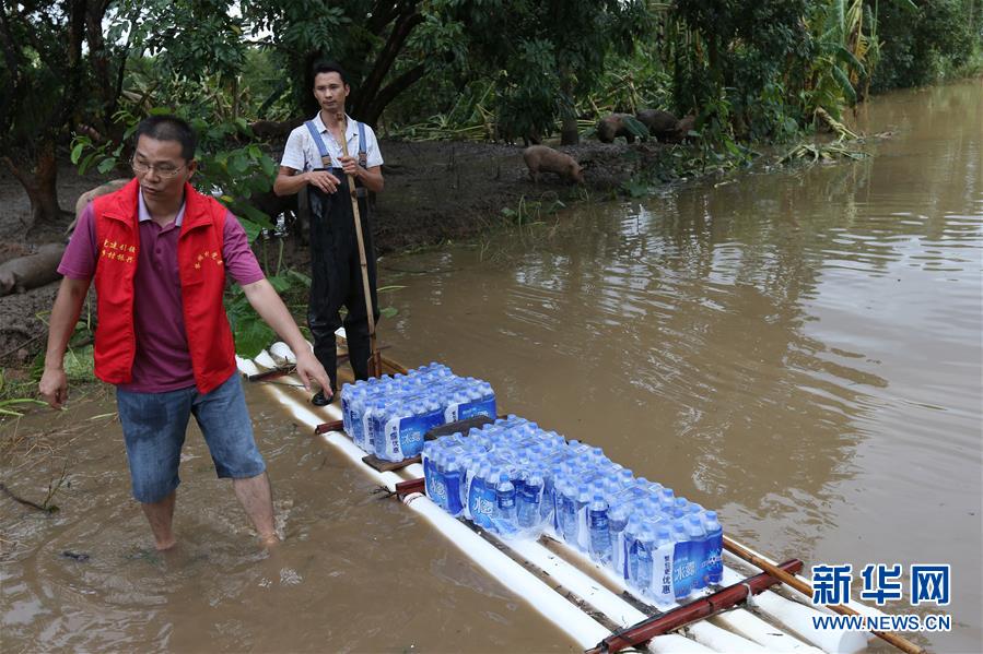 9月18日,在廣東省陽(yáng)江市陽(yáng)春市,人們用筏子運(yùn)送飲用水。 新華社記者張加揚(yáng)攝