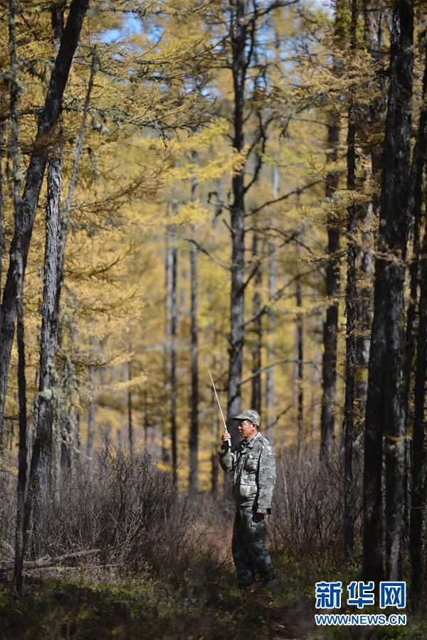 9月18日,在內(nèi)蒙古大興安嶺根河林業(yè)局約安里林場,林場職工廉立臣與其他林場職工通過對講機(jī)溝通尋找馴鹿的情況。新華社記者鄒予攝