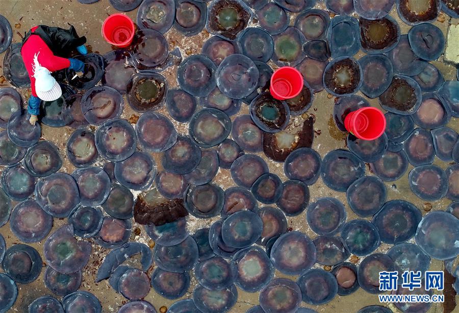 9月21日,灤南縣南堡鎮(zhèn)南堡二村一家海蜇養(yǎng)殖場的工人在海蜇鹵制池內擺放海蜇(無人機拍攝)。新華社記者楊世堯攝