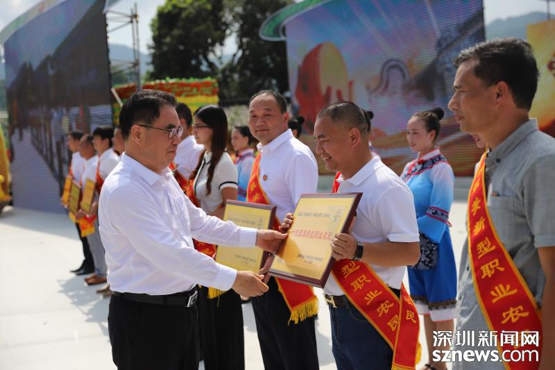 慶祝首屆“中國(guó)農(nóng)民豐收節(jié)”活動(dòng)在梅州大黃村舉行,廣東省政府副省長(zhǎng)葉貞琴為十佳最美新型職業(yè)農(nóng)民頒獎(jiǎng)。