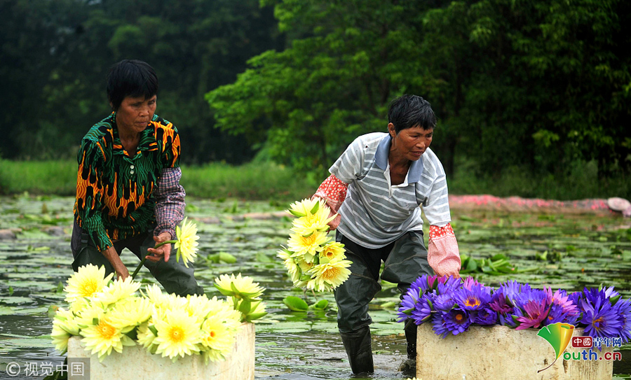 廣西柳州,柳北區(qū)石碑坪鎮(zhèn)下陶村的農(nóng)民在采摘的九品香蓮。圖片作者:陳健明