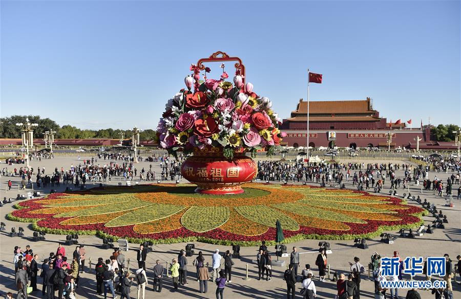當(dāng)日,“祝福祖國(guó)”巨型花籃在北京天安門廣場(chǎng)全面亮相。據(jù)了解,從2011年開始,“祝福祖國(guó)”巨型花籃一直作為天安門廣場(chǎng)中心花壇的主景在國(guó)慶節(jié)期間向祖國(guó)獻(xiàn)禮。今年花籃內(nèi)布置有紅掌、梅花、康乃馨、向日葵、蘭花、月季等多種仿真花卉,寓意幸福吉祥。 新華社記者 李賀 攝