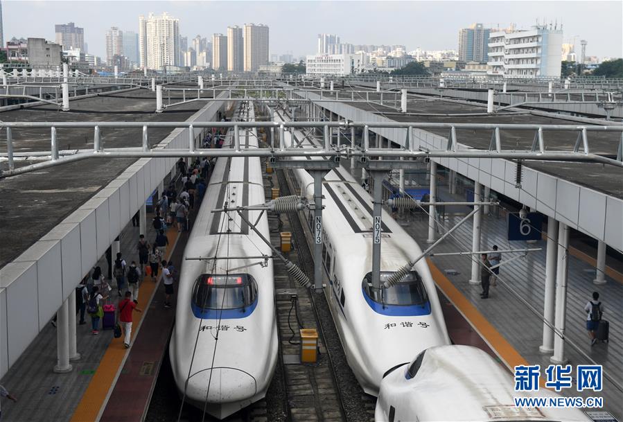 在廣西南寧站,旅客進(jìn)入站臺(tái)準(zhǔn)備乘坐動(dòng)車出行(9月4日攝)。 廣西壯族自治區(qū)成立60年來,鐵路建設(shè)發(fā)生翻天覆地的變化。來自中國鐵路南寧局集團(tuán)有限公司的數(shù)據(jù)顯示,1958年廣西鐵路總里程為1346.3公里,如今廣西鐵路總里程達(dá)5191公里。廣西與周邊相鄰省份間實(shí)現(xiàn)動(dòng)車“公交化”開行。此外,北部灣港—重慶班列、東盟海產(chǎn)品冷鏈班列、“百色一號(hào)”果蔬專列等的開通和運(yùn)營,強(qiáng)化了鐵路供給的針對(duì)性和有效性。鐵路成為助推廣西經(jīng)濟(jì)社會(huì)快速發(fā)展的“大動(dòng)脈”。 新華社記者陸波岸攝