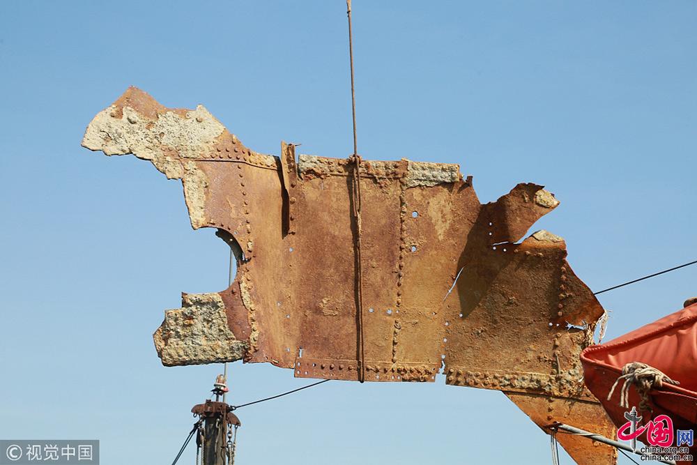 2018年9月25日,遼寧大連,考古工作人員把一片“經(jīng)遠(yuǎn)艦”裝甲進(jìn)行吊裝轉(zhuǎn)運(yùn)。視覺(jué)中國(guó)