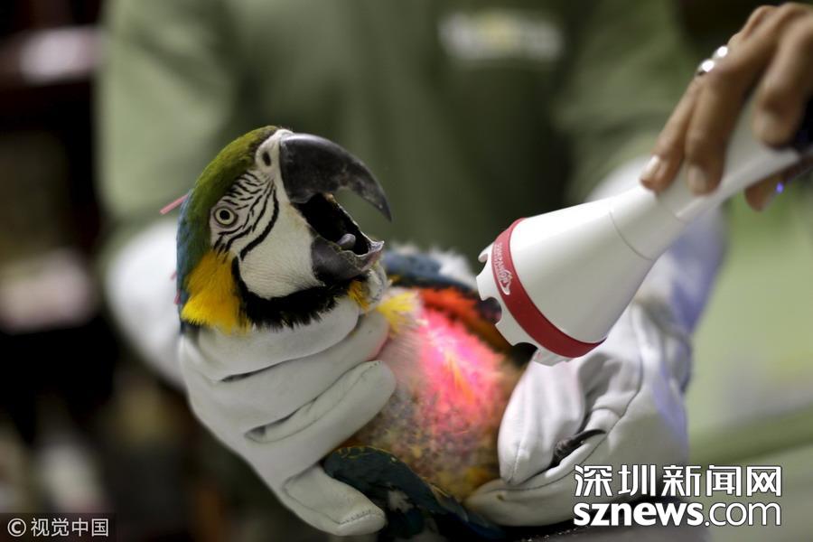 當(dāng)?shù)貢r(shí)間2015年7月30日,巴西巴西利亞,一只藍(lán)喉金剛鸚鵡正在接受激光治療。
