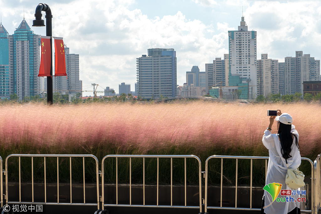 2018年9月28日,上海,東外灘楊浦濱江的粉黛亂子草目前已進入盛花期,當(dāng)日早間,不少市民來到濱江拍照賞景,成片的紫色花海在藍(lán)天白云映襯下美不勝收。圖片作者:王岡/視覺中國