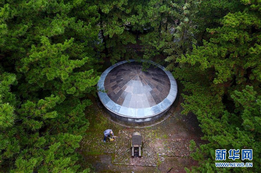 趙乃堂在黃崖洞烈士陵園內(nèi)打掃(9月19日無(wú)人機(jī)拍攝)。 新華社記者 詹彥 攝