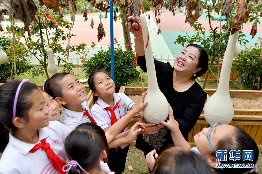 9月29日,在威海市經(jīng)濟技術(shù)開發(fā)區(qū)新都小學(xué),老師帶著學(xué)生采摘葫蘆。