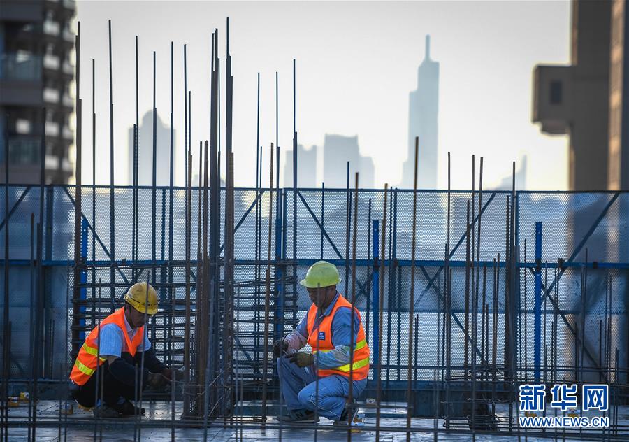 10月1日,中建三局三公司建筑工人在南京世茂外灘新城項目現(xiàn)場施工。當(dāng)日是國慶節(jié),許多勞動者堅守在工作一線,在崗位上度過節(jié)日。新華社記者李響攝