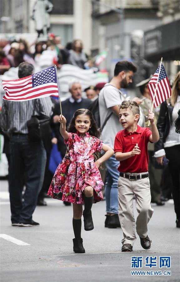10月8日,在美國紐約曼哈頓第五大道,兩名兒童參加哥倫布日游行。 新華社記者王迎攝