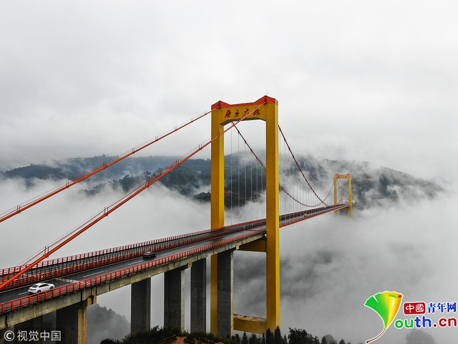 10月9日消息,普立大橋搭建在北盤(pán)江上,連接貴州都格與云南普立,北盤(pán)江兩岸風(fēng)光十分秀美,兩省雖然沒(méi)有開(kāi)發(fā)專(zhuān)門(mén)的旅游線路和風(fēng)景區(qū)推薦,可是秀麗的喀斯特風(fēng)光總吸引一些專(zhuān)門(mén)尋找原生態(tài)自然風(fēng)光的游客。圖片來(lái)源:視覺(jué)中國(guó)