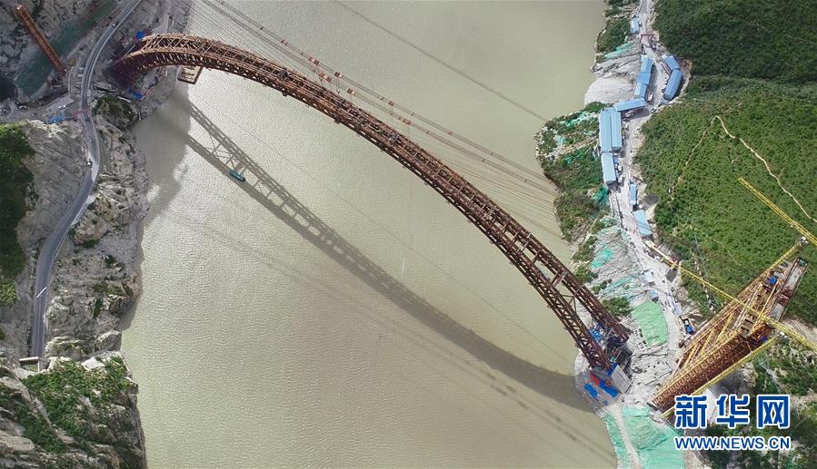 9月28日無人機拍攝的川藏鐵路拉林段重點標(biāo)志性工程藏木特大橋。 當(dāng)日,隨著最后一節(jié)鋼管拱的對位和鎖定完畢,川藏鐵路拉林段藏木特大橋成功合龍,標(biāo)志著大橋主體結(jié)構(gòu)施工取得了關(guān)鍵性勝利。藏木特大橋由中國中鐵廣州局集團承建,拱高112米,橋橫跨雅魯藏布江峽谷,水深66米。 新華社記者普布扎西攝