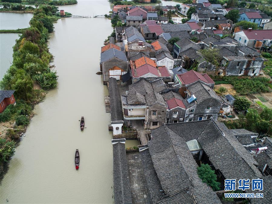 10月10日,泉家潭村村民劃著小船經(jīng)過沿河長廊(無人機(jī)拍攝)。經(jīng)過改造提升后,沿河長廊和整潔的古村街巷成為當(dāng)?shù)孛利愢l(xiāng)村的景觀帶。 新華社記者 徐昱