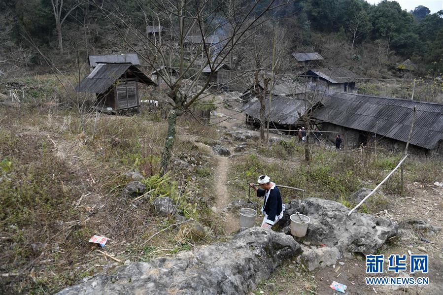 在廣西南丹縣里湖瑤族鄉(xiāng)仁廣村,一名白褲瑤族同胞在挑水(1月12日攝)。如今,搬遷后的白褲瑤族同胞都用上了自來水。新華社記者 周華 攝