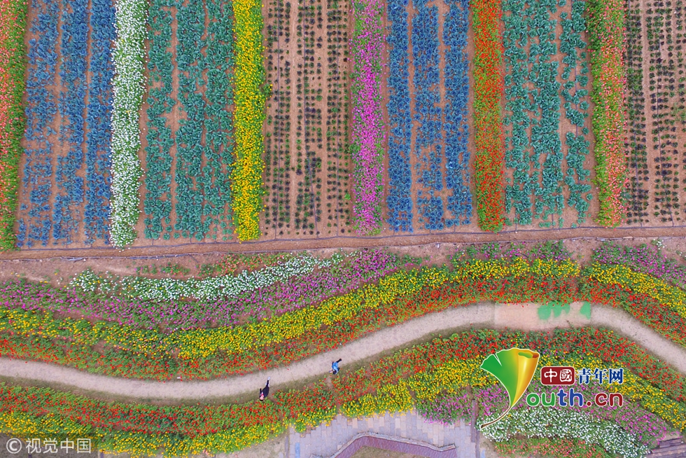 2018年10月14日,江蘇南京,江寧區(qū)谷里街道徐家院村的50萬(wàn)株百日菊競(jìng)相綻放,大紅、黃色、紫色……遠(yuǎn)遠(yuǎn)望去仿佛是田野間鋪上一層“五彩地毯”, 成了金秋里一道花宴盛景,吸引不少游人徜徉其中。圖片作者:方東旭/視覺中國(guó)