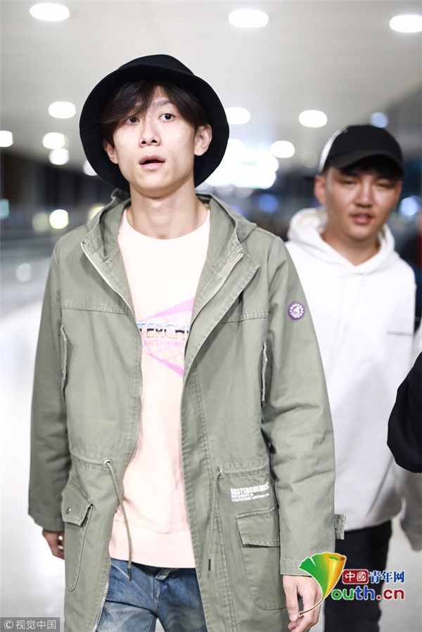 2018年10月14日,上海,張一山抵達上海機場。張一山戴漁夫帽眼袋嚴(yán)重瞬間老十歲, 用手擋臉?biāo)撇辉干乡R。