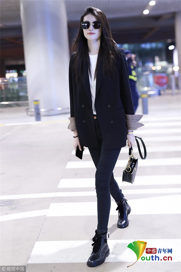 2018年10月15日,上海,何穗亮相機(jī)場。她身穿深色西裝搭配黑色緊身褲大秀超模身材,簡約造型依舊高級感十足,輕撩秀發(fā)散發(fā)女人味。