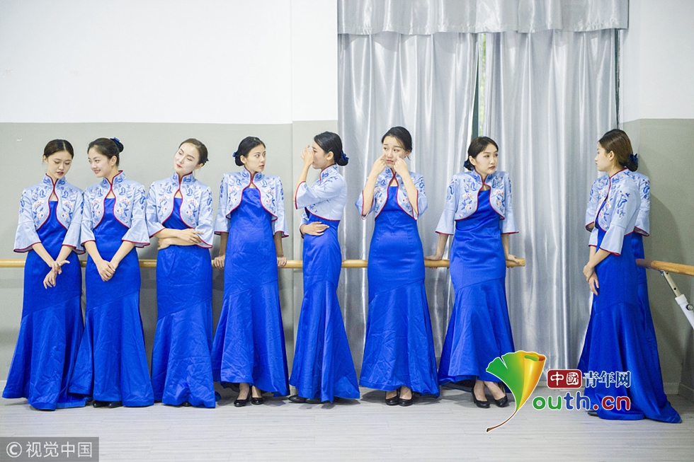 來(lái)自浙江傳媒學(xué)院的禮儀志愿者們正在進(jìn)行緊張有序的集中訓(xùn)練。圖片作者:浙江日?qǐng)?bào) 馮賀/視覺(jué)中國(guó)