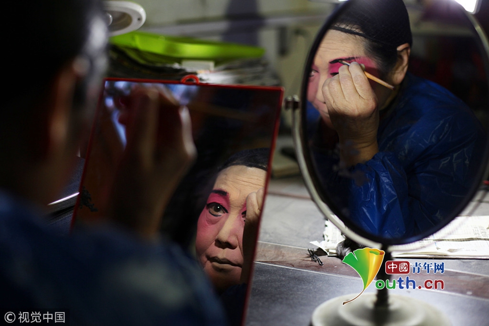 2016年3月10日,陜西安康,今年70歲的劉鳳鳴10歲時(shí)開(kāi)始學(xué)漢調(diào)二黃,40歲時(shí)從廁所抱回智殘?bào)w殘棄嬰,因?yàn)閷?duì)藝術(shù)的熱愛(ài)、對(duì)生命的敬畏她選擇了不離不棄。人生如戲,戲如人生。劉鳳鳴說(shuō),像她們這樣的業(yè)余劇團(tuán),沒(méi)有專門的化妝師,她要求每個(gè)演員必須學(xué)會(huì)化妝。圖片作者:魏永賢/視覺(jué)中國(guó)