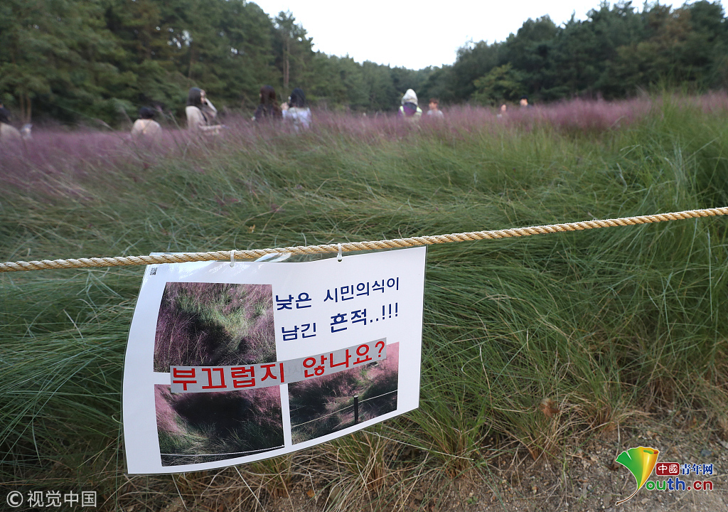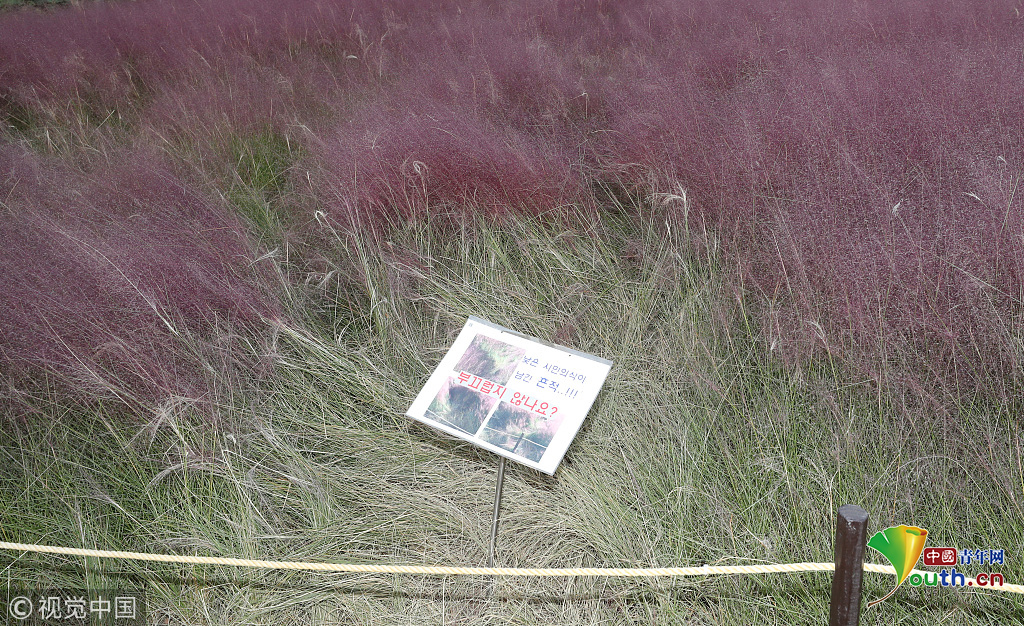 當(dāng)?shù)貢r間2018年10月16日,韓國蔚山,近日,蔚山公園大片粉黛亂子草盛開,粉紅花海浪漫十足,但部分花海遭游客隨意踩踏。公園并沒有修復(fù)遭破壞區(qū)域,而是用繩索圍起并掛上批判性告示,呼吁游客腳下留情。圖片作者:Yonhap News Agency