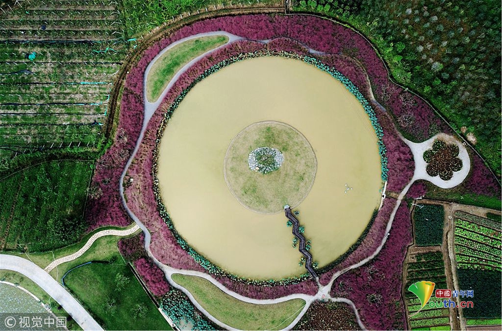 由于這些粉色亂子草圍繞一個圓形的池塘種植,從空中俯瞰則是另外一番景象,湖心島、池塘,粉黛、草坪與周邊的綠色植物形成了一個特別的唯美圖案。