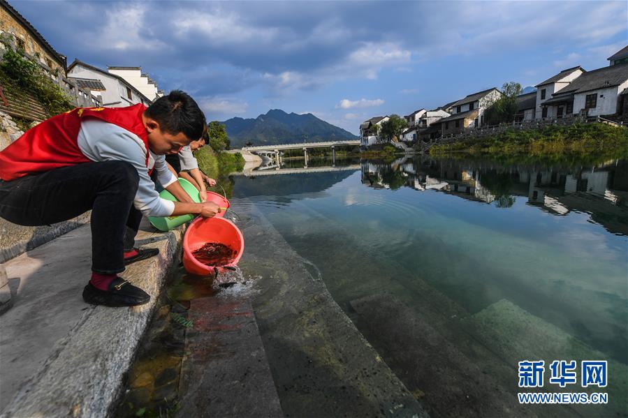 10月17日,河橋鎮(zhèn)的青年黨員們在鎮(zhèn)邊的昌南溪投放魚苗。