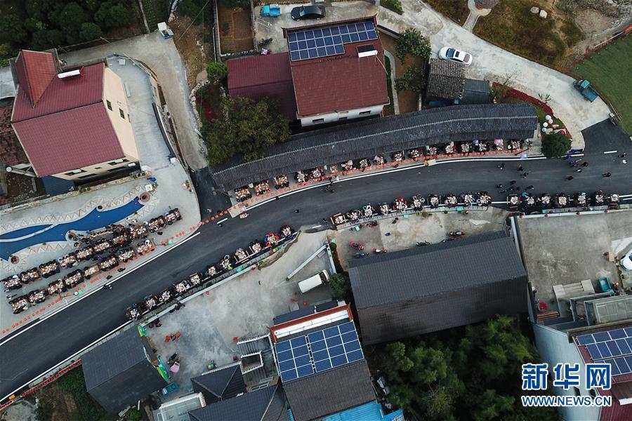10月17日,村民與賓客在龍峰民族村參加“長(zhǎng)桌宴”(無(wú)人機(jī)拍攝)。 當(dāng)日,在浙江省桐廬縣莪山畬族鄉(xiāng)龍峰民族村,一百桌宴席沿道路擺成一字長(zhǎng)蛇陣,四方賓客和當(dāng)?shù)卮迕褚黄鹌穱L著具有畬族特色的菜肴,場(chǎng)面頗為壯觀。 新華社記者 黃宗治 攝