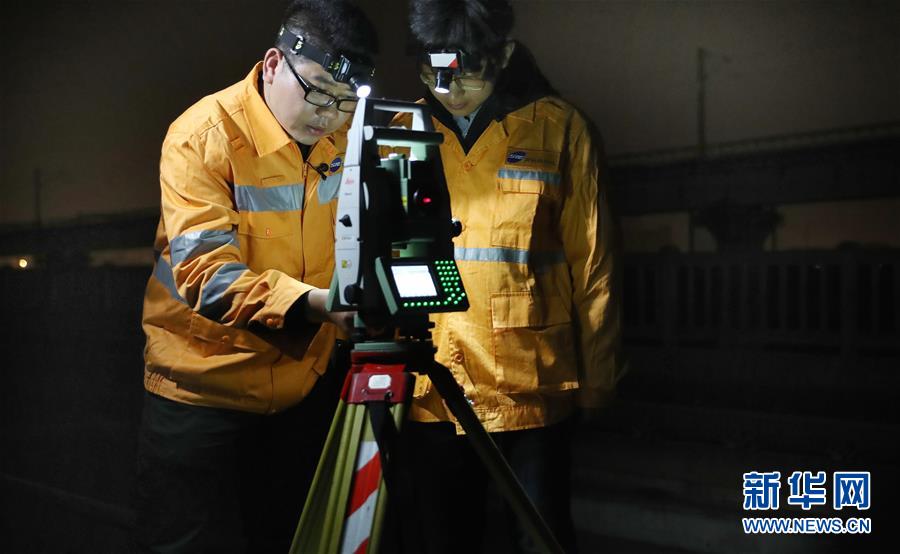 10月18日,劉訓飛(左)在滬寧城際上海安亭北線路所42#道岔上進行線路檢測作業(yè)時,向徒弟郎海鵬講解全站儀設置方法。新華社記者 方喆 攝