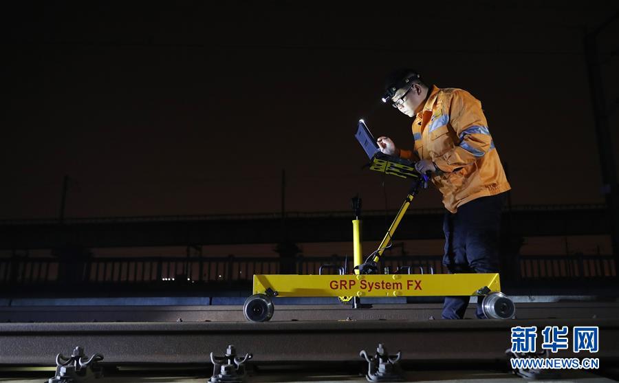10月18日,劉訓飛在滬寧城際上海安亭北線路所42#道岔上使用軌檢小車檢測線路。 新華社記者 方喆 攝