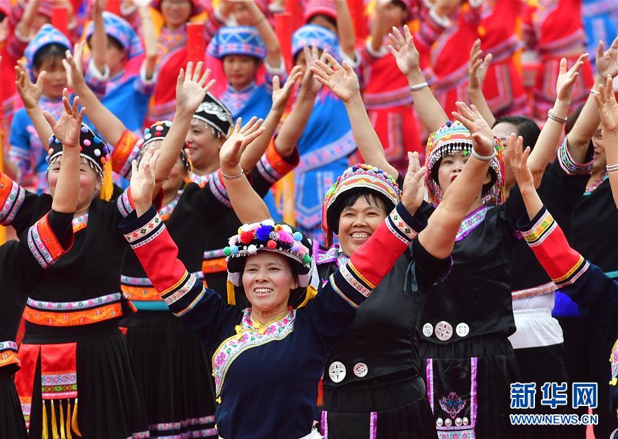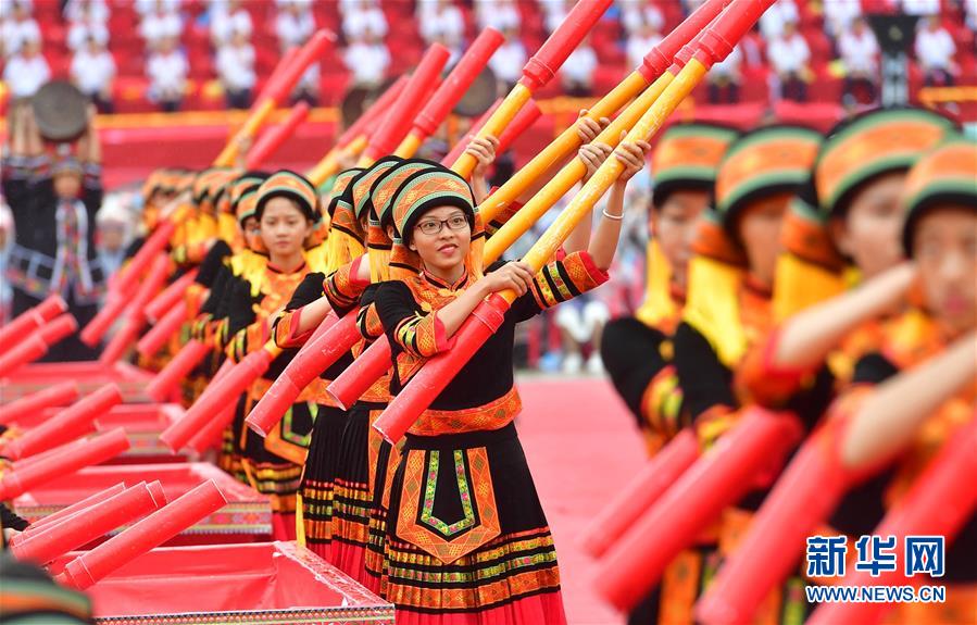 10月20日,各族同胞在廣西大化瑤族自治縣江濱文化廣場(chǎng)表演節(jié)目,慶??h慶。
