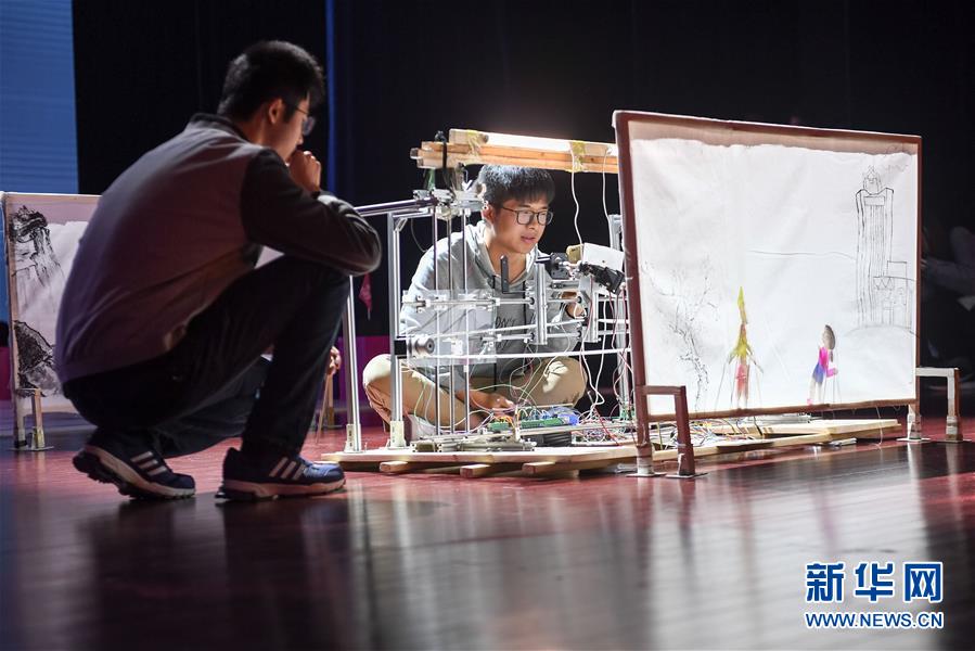 10月21日,在位于安徽合肥的中國(guó)科學(xué)技術(shù)大學(xué),“人五成影”隊(duì)帶著皮影戲機(jī)器人參加比賽。新華社記者張端攝