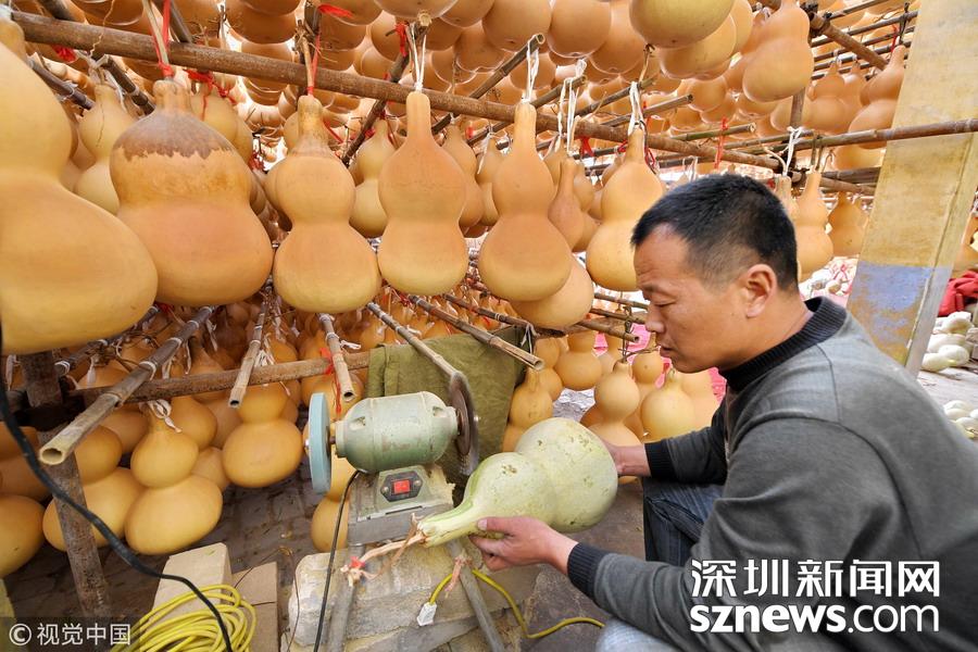 山西聞喜縣禮元鎮(zhèn)阜底村農(nóng)民趙雙慧對葫蘆進行削皮處理。