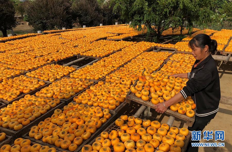 10月17日,廣西桂林市平樂縣沙子鎮(zhèn)渡河村農(nóng)民在晾曬柿子(手機拍攝)。 金秋時節(jié),農(nóng)民們忙著收獲成熟的農(nóng)作物,喜迎豐收。 新華社記者 黃孝邦 攝