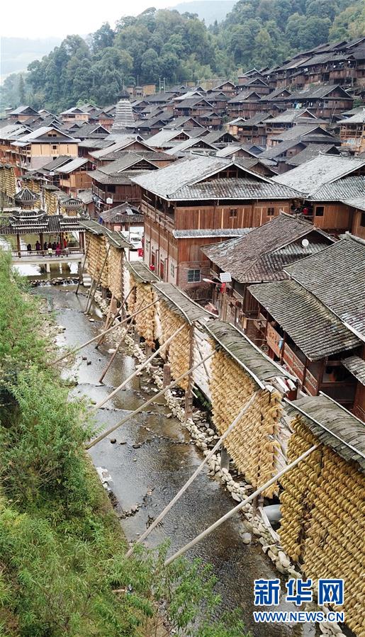 這是貴州省黔東南苗族侗族自治州從江縣高增鄉(xiāng)占里村一處屋檐下晾曬的稻谷(10月17日攝)。 金秋時節(jié),農(nóng)民們忙著收獲成熟的農(nóng)作物,喜迎豐收。 新華社記者陳曄華攝
