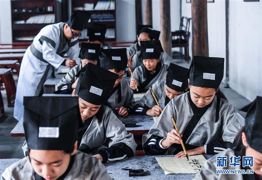 10月23日,學(xué)生們在參加“誠敬日”傳統(tǒng)書法學(xué)習(xí)。當(dāng)日,浙江省長興縣第八小學(xué)舉行“誦家規(guī)家訓(xùn),傳中華美德”校園“誠敬日”主題教育活動(dòng),通過誦讀國學(xué)經(jīng)典、講勵(lì)志故事、演美德戲劇等形式,讓學(xué)生感受優(yōu)秀傳統(tǒng)文化。近年來,該學(xué)校立足“誠敬”文化,注重國學(xué)啟蒙教育,讓學(xué)生從小培養(yǎng)“以誠立身、以敬處事”的良好品質(zhì)。新華社記者 徐昱 攝