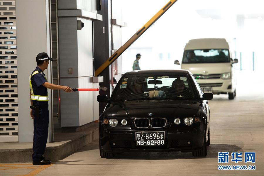 10月24日,首輛私家車在澳門口岸離境車道上通關。當日9時,港珠澳大橋正式通車。 新華社記者張金加攝