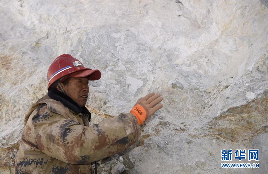 在昆侖山上海拔4000米的興發(fā)達(dá)玉礦,工程師田仲祥展示一塊正在開(kāi)采的玉石礦體(10月23日攝)。 新華社記者武巍攝