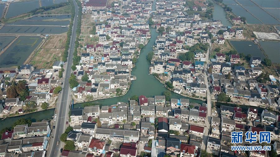 開弦弓村村貌(10月23日無人機(jī)拍攝)。小清河穿村而過,從高空俯瞰,南村河道像張弓,北村河道像支箭,村名由此而來。 新華社記者 季春鵬攝