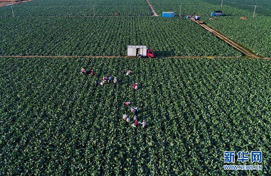 10月29日,樂(lè)亭縣馬頭營(yíng)鎮(zhèn)馬頭營(yíng)村的農(nóng)民在收獲菜花(無(wú)人機(jī)拍攝)。 新華社記者楊世堯攝