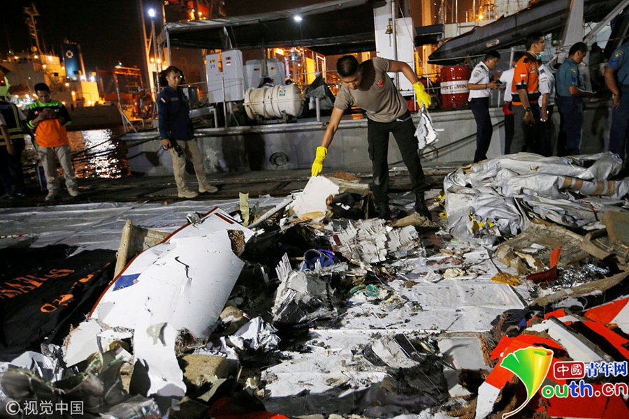 搜救人員打撈上來飛機(jī)的殘骸。