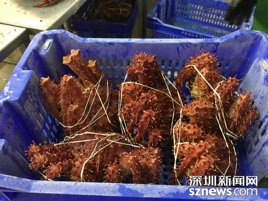 深圳新聞網(wǎng)訊   蜘蛛蟹(又名皇帝蟹)只產(chǎn)于南北兩極冰冷的海洋中,因為八條腿特長,外觀形似蜘蛛,而且觸角也比普通螃蟹多,所以被稱為蜘蛛蟹,大個的重量可達(dá)5公斤以上。智利政府規(guī)定,小于1.5公斤的不許捕撈。