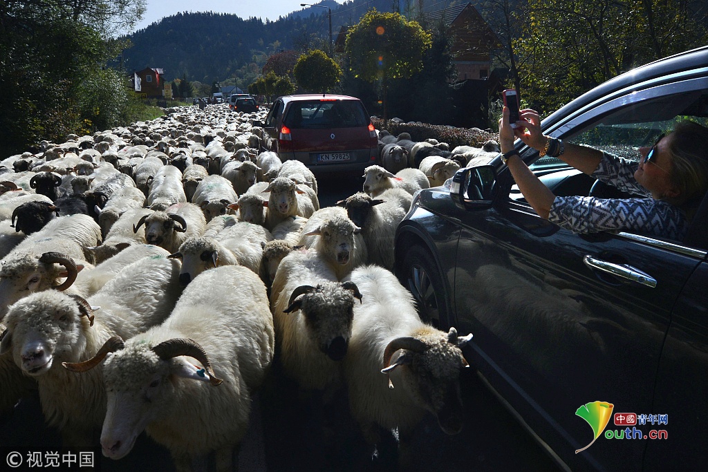 2018年9月27日訊(具體拍攝時間不詳),波蘭,浩浩蕩蕩的綿羊大軍為了趕在冬天之前回到農(nóng)場過冬,阻斷了鄉(xiāng)村的主車道。