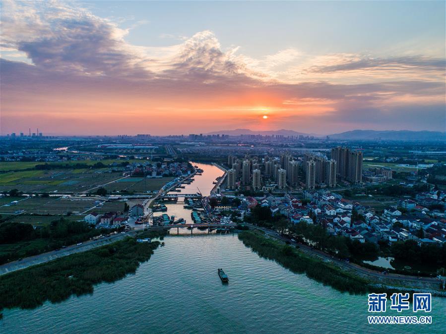 這是2018年9月27日航拍的夕陽下的新塘村。浙江省長興縣新塘村毗鄰太湖,該村以蔬菜種植、水產(chǎn)捕撈為主導(dǎo)產(chǎn)業(yè),素有“浙北水產(chǎn)第一村”之稱。新華社記者 徐昱 攝